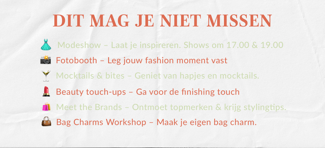 Let op: er zijn een beperkt aantal plekken beschikbaar! Kosten: €12,50,- per persoon en zijn inclusief modeshow, mocktails en bites. Gezellig met moeder, dochter, zus of vriendin. Wie neem jij mee? Jullie zijn van harte welkom! |  | |